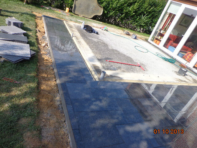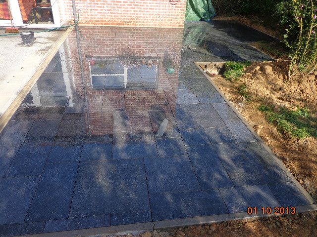 Après je monte donc mes blocs lourds de fondation pour la véranda comme pour la construction d’une annexe ou d’une villa, une fois élevée cette maçonnerie me servira de coffrage pour couler la dalle de sol de la future pergola. Derrière mes blocs bien entendu je place un platon de protection et je fais un ciment goudronné pour protéger le pied de fondation de l’humidité montante et je n’oublie pas non plus de placer un drain de diamètre 100 micro perforé qui récoltera les eaux des terres, puis par dessus je place 20CM de gravier en 32/20 servant de draineur des eaux vers le drain. Avec ça aucune chance d’avoir de l’humidité dans le bas des murs de plus que je relie le drain à la chambre de visite existante. Au final je place mes pierres bleues en tour de la véranda et le placeur n’aura plus qu’à faire son travail!