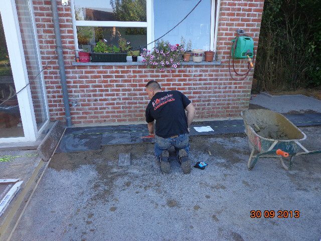 Pour la terrasse, j’ ai bétonné tout va bien maintenant je place donc mes grilles passerelles pour récupéré les eaux pluviales et bien entendu je les raccordent à la chambre de visite aussi avec des tuyaux en diamètre 40, ensuite je commence à carrelé avec mes céramiques extérieures qui sont en 4 modules différents donc je dois bien calculé mon coup sinon je me retrouve avec des erreurs à la fin. Enfin ici tous va bien, je fini par couler à l’ancienne et je termine donc ce travail de terrasse et de véranda.